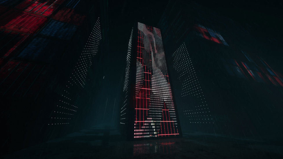 The installation space is built around a system of industrial containers, onto which fragmented images and light patterns are projected. The LED system pulses in sync with the sound, visualizing incoming and outgoing data flows, while a transparent screen adds depth and multi-layered perception.